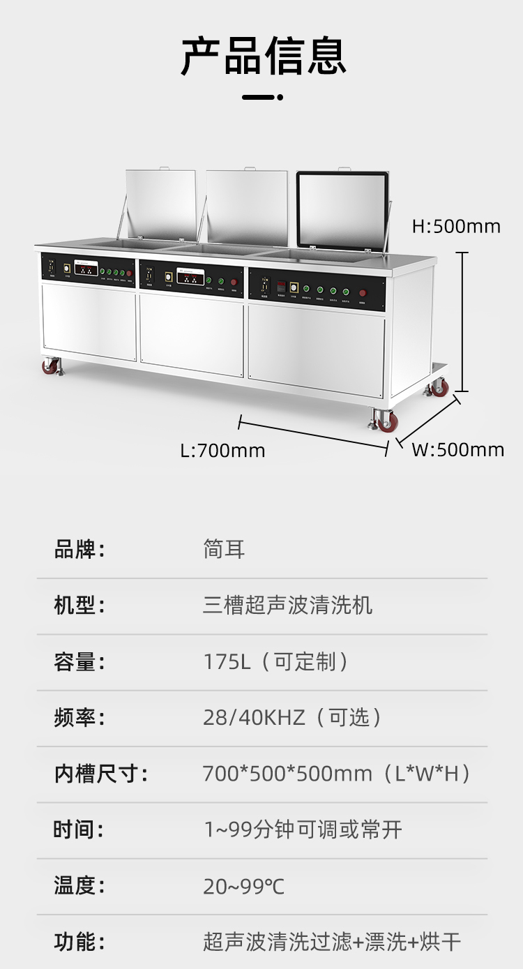 工艺:1#超声波粗洗+过滤,2#超声波漂洗,3#热风循环烘干